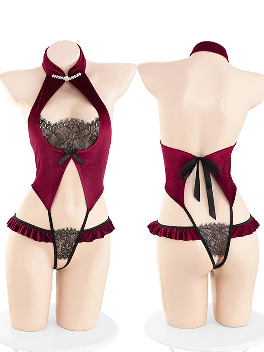 Crotchless Velvet Chinese Lace Bodysuit