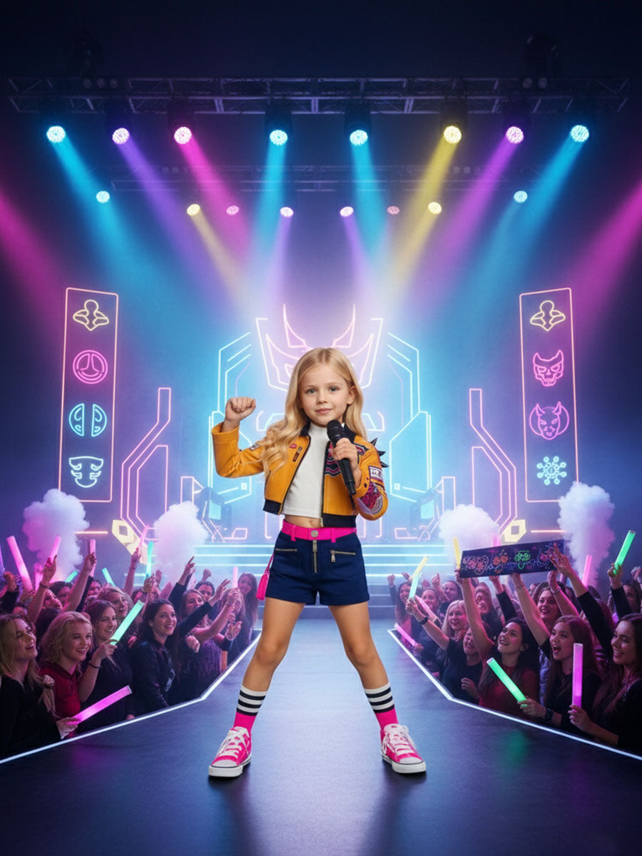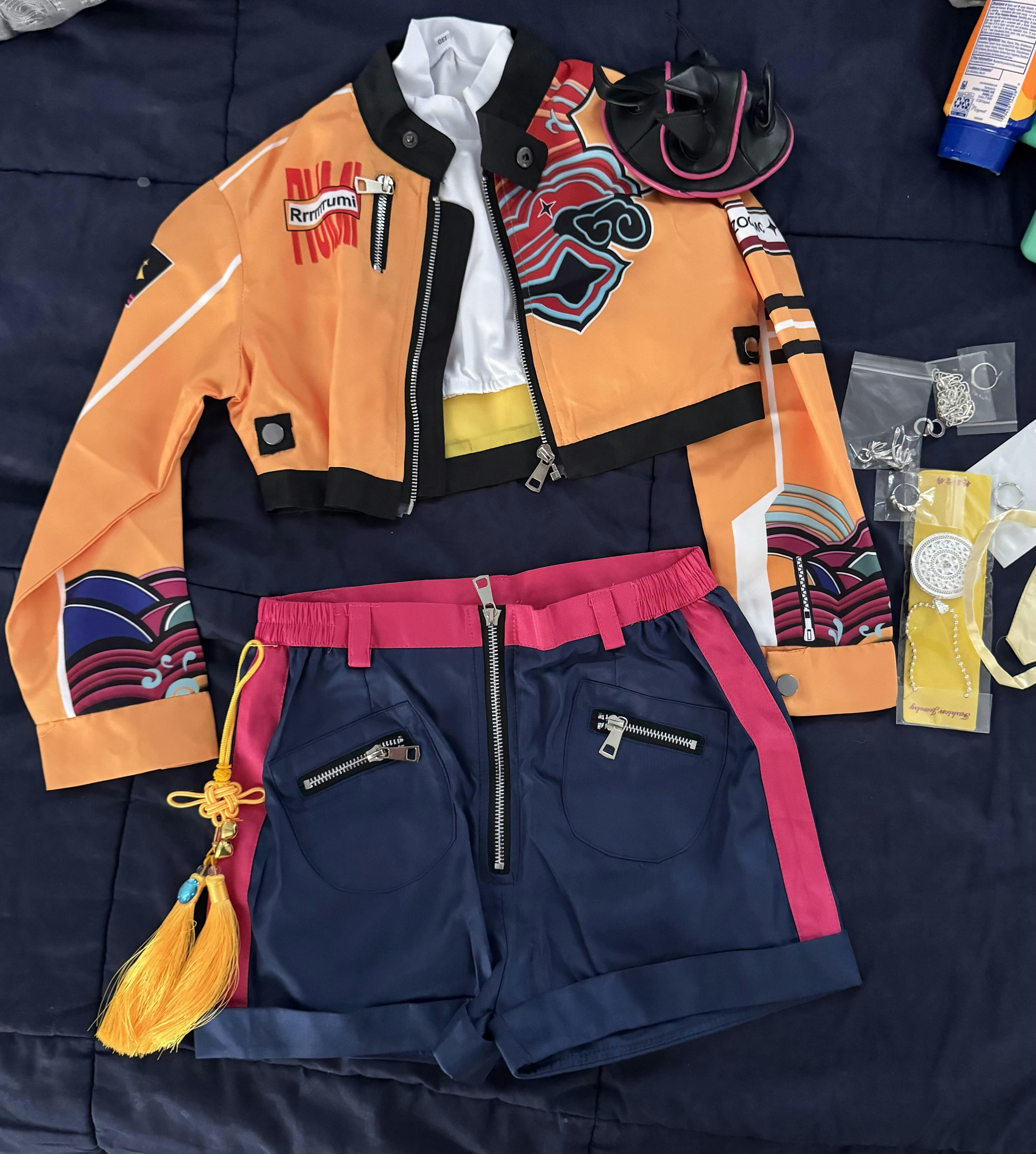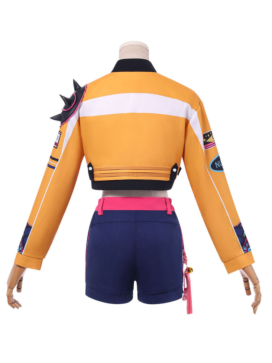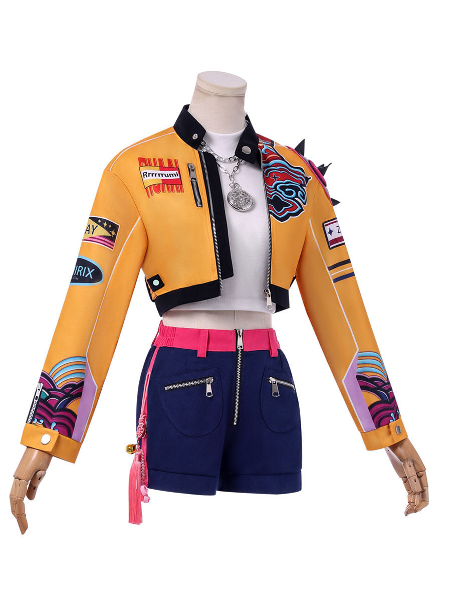 Design: This Idol Tech Hunter Costume Set features a vibrant cropped yellow jacket adorned with racing-inspired patches and abstract tech graphics, paired with blue and hot-pink shorts detailed with side zippers and a tassel accent for added flair. A layered white crop top completes the look. Metallic accessories—rings, earrings, and a statement necklace—add a sleek cyberpunk edge, while a traditional-style knot ornament adds a touch of cultural fusion.