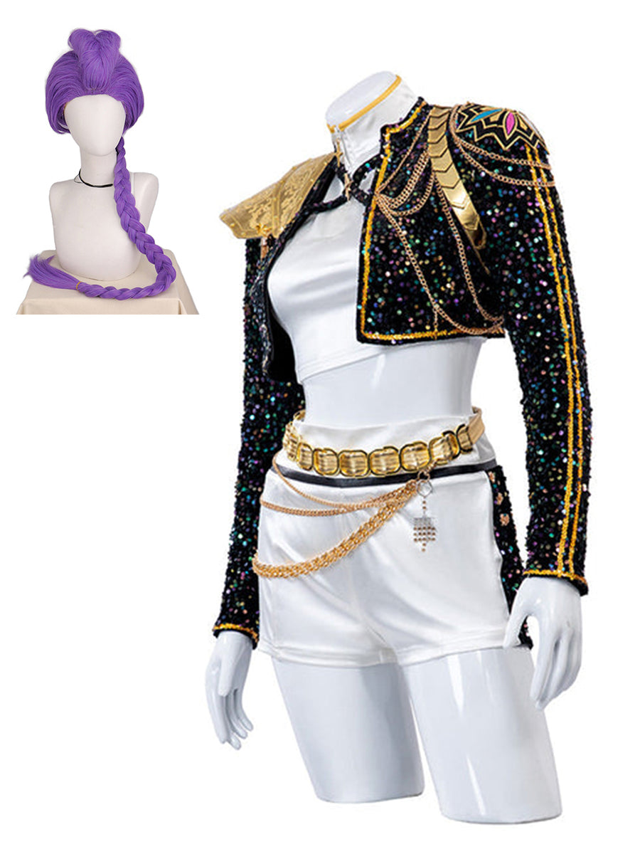 Design: This Golden Idol Costume features a sequined cropped jacket adorned with ornate gold shoulder armor, chains, and star motifs, a high-neck white crop top with zipper, a high-waisted white shorts and golden accessories to complete the glamorous, battle-ready look. This costume combines K-pop glam with fierce, fantasy-inspired armor detailing to make you unforgettable on stage.