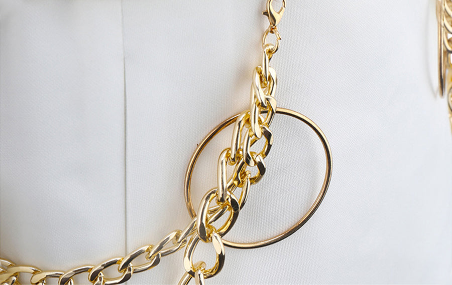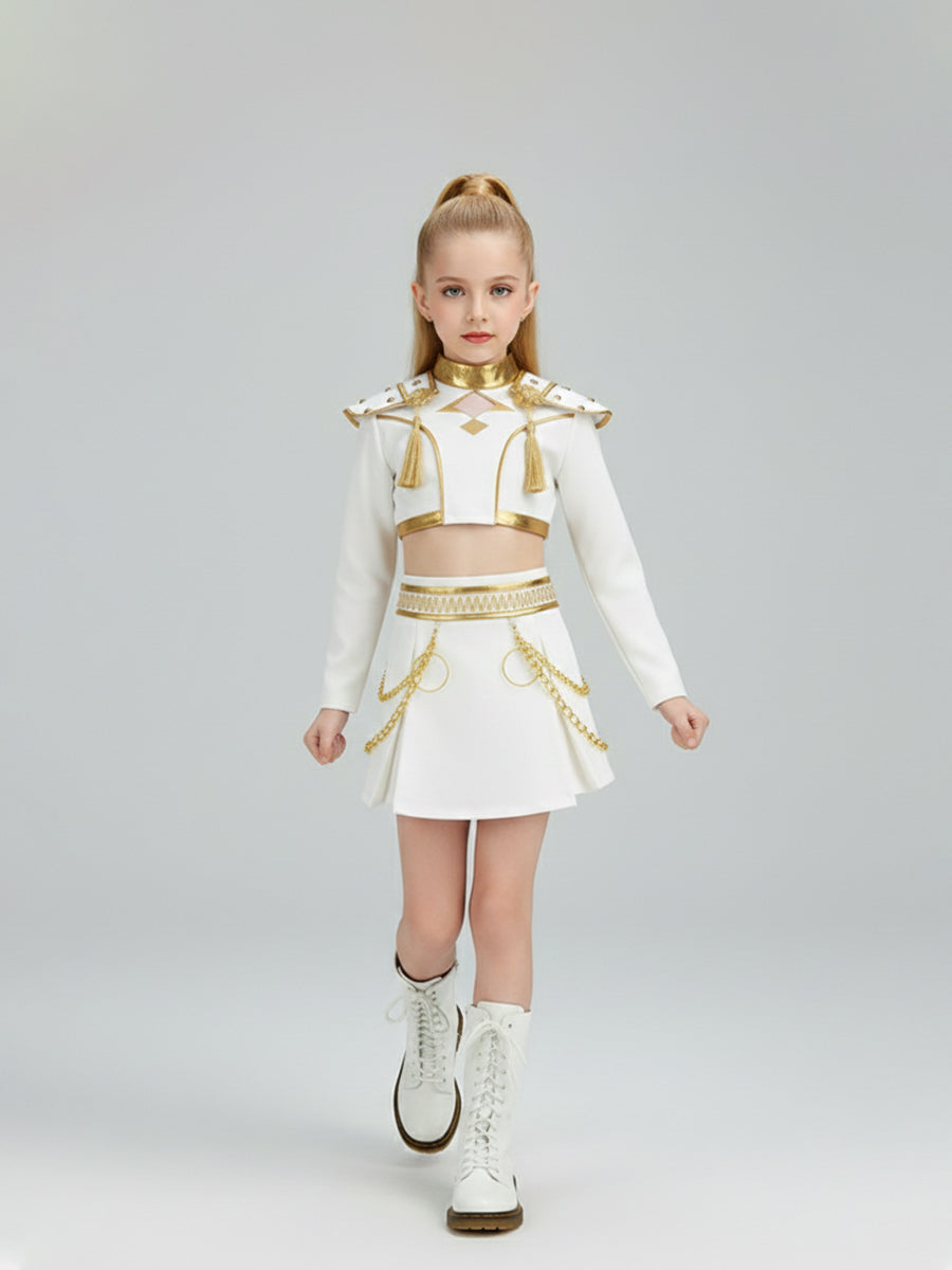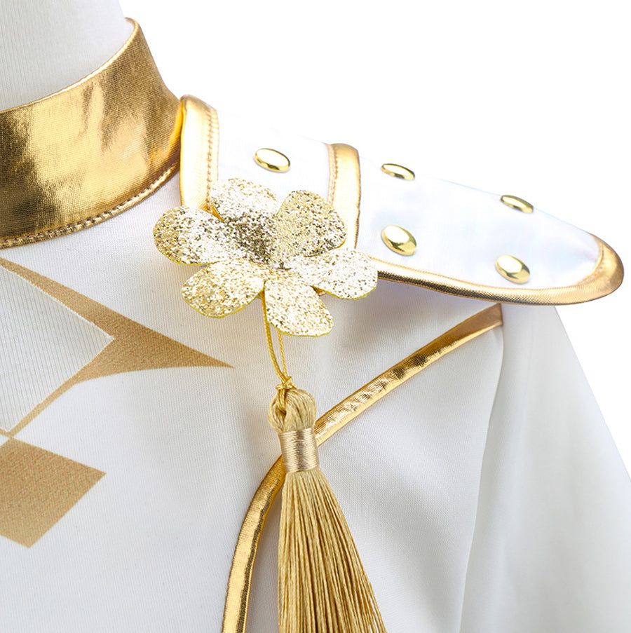 Design: This Demon Huntress White Stage Outfits features a cropped long-sleeve top, bold shoulder epaulets with gold tassels, a fitted silhouette, and a matching high-waisted mini skirt with a golden sash, restores the roles character.