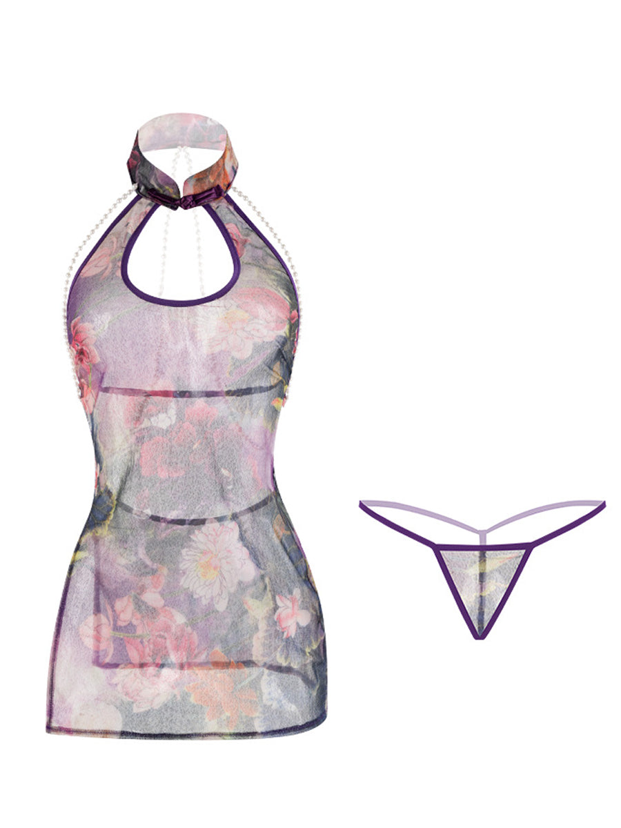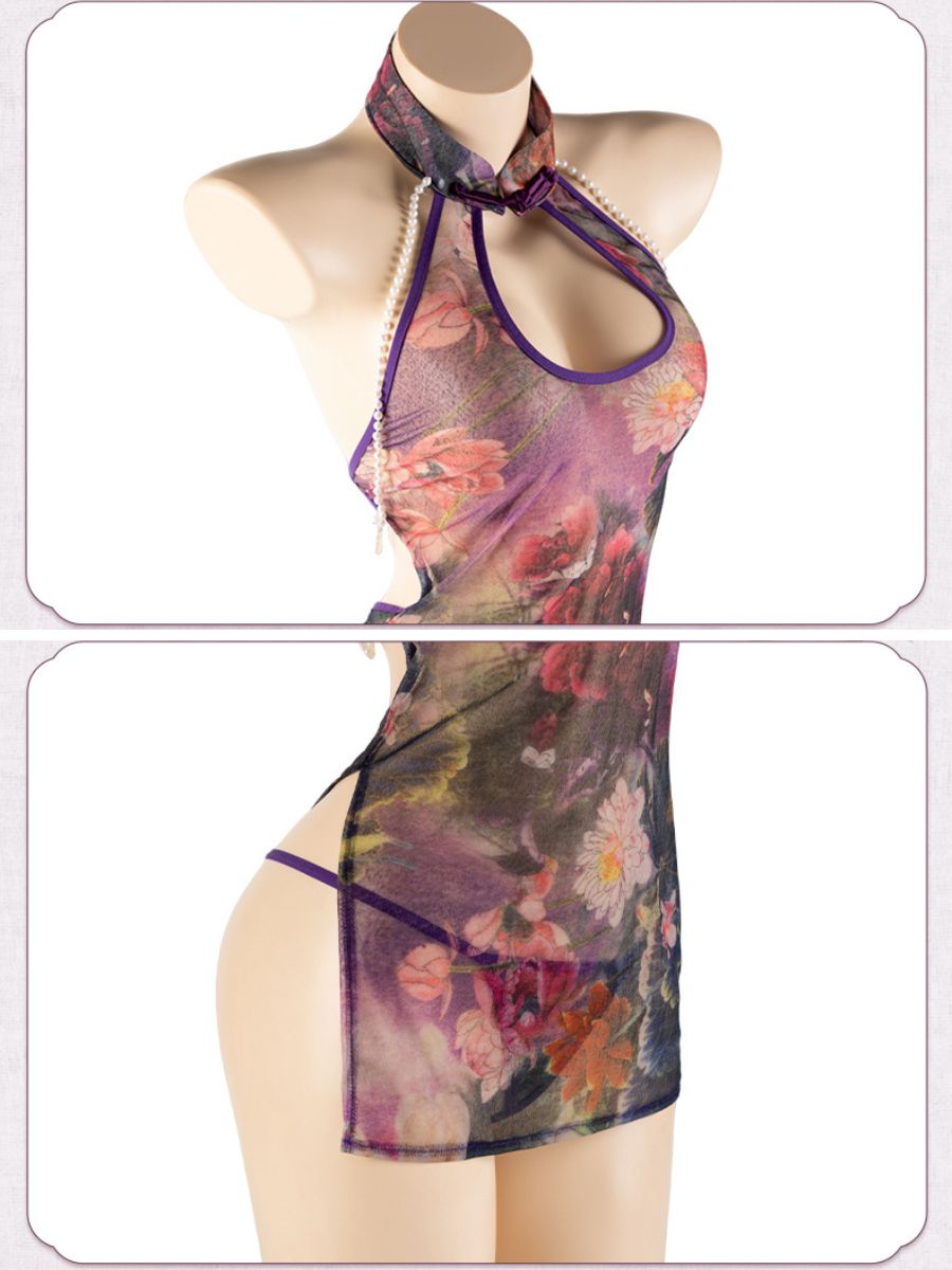 Design: Command the room in this Sheer Floral Cheongsam set featuring a mandarin collar with a daring keyhole bust cutout, an all-over hazy floral print, ultra-high side slits to showcase your legs, a breathtaking open back with cascading pearl-beaded chains, and a matching sheer G-string.
