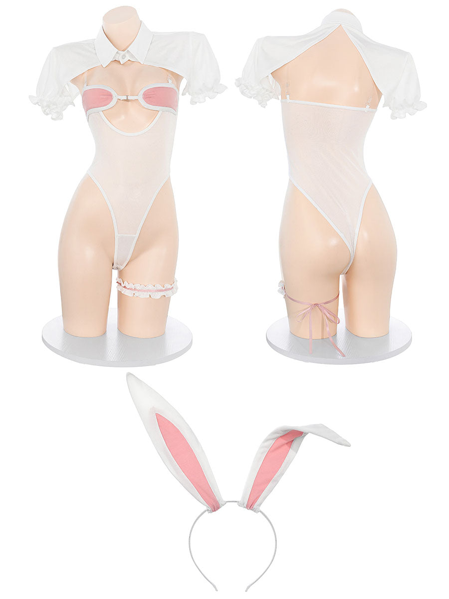 Design: This Enchanting Bunny Maid Cosplay Lingerie Set features a hollow-out, open-bust design bodysuit with delicate pink accents, an Iconic Bunny Headpiece, a Short, puff-sleeved shrug, matching Long, sheer gloves, an Adjustable, ruffled white apron, a Delicate thigh ring, and Sheer legwear to complete the sleek silhouette. This sexy costume provides all the components for a truly magical evening.