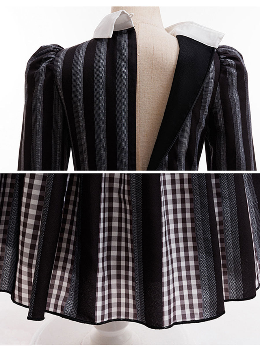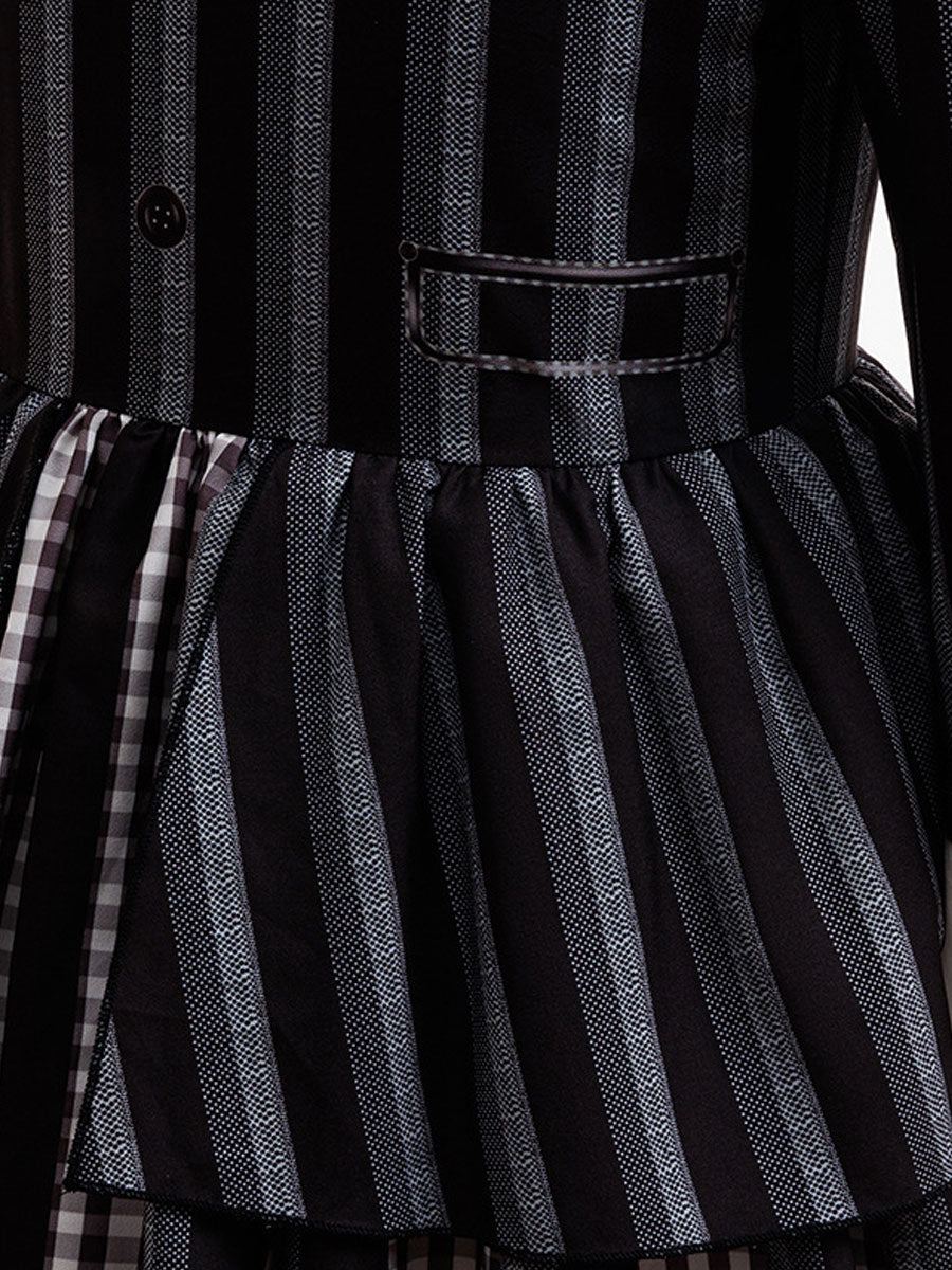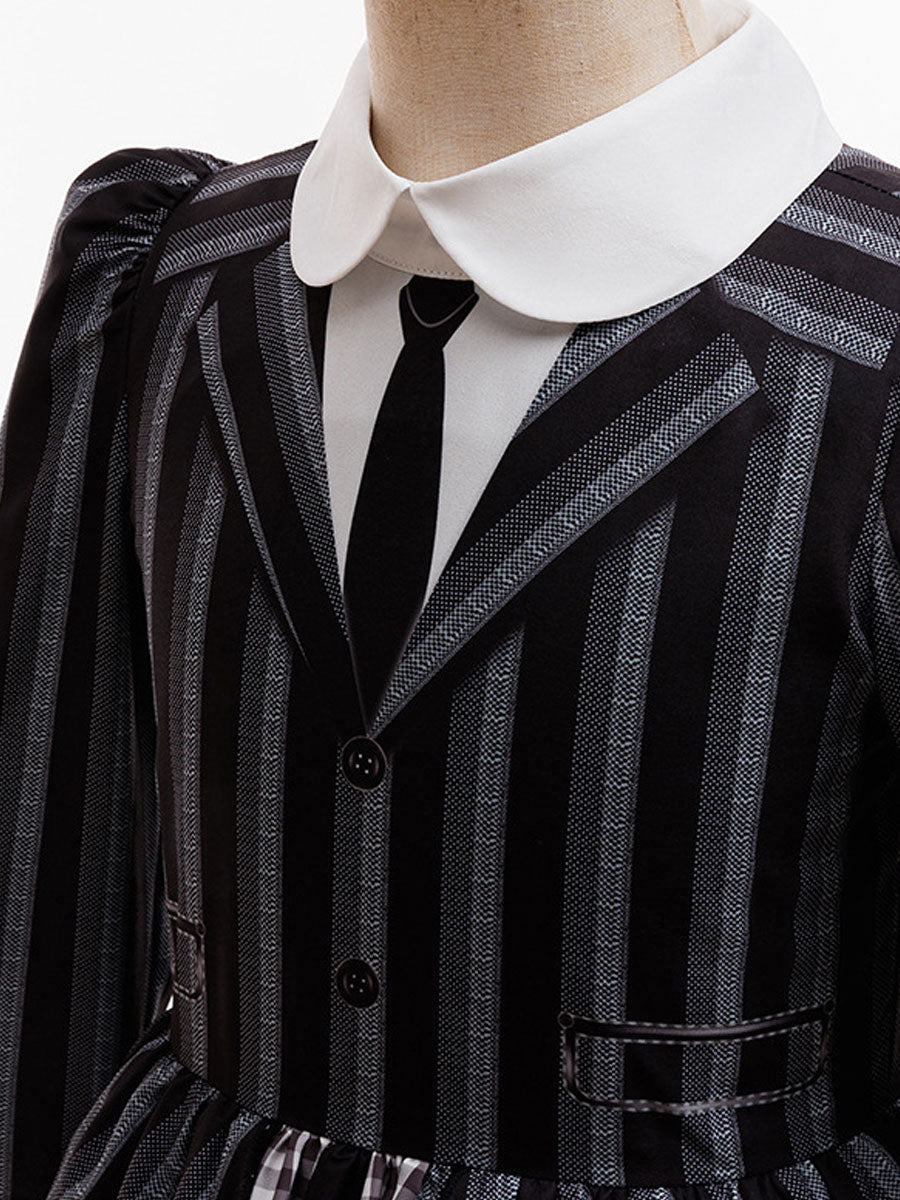 Design: This kids’ gothic schoolgirl costume creates a mysterious yet stylish Halloween look. Featuring a black-and-white striped dress with a crisp white collar, buttoned bodice, and printed tie, it blends classic elegance with a spooky twist. The layered skirt design with plaid detailing adds extra charm, while long sleeves and a neat silhouette make it perfect for parties, cosplay, or themed events. A simple yet iconic outfit that captures the spirit of dark academia style for children.