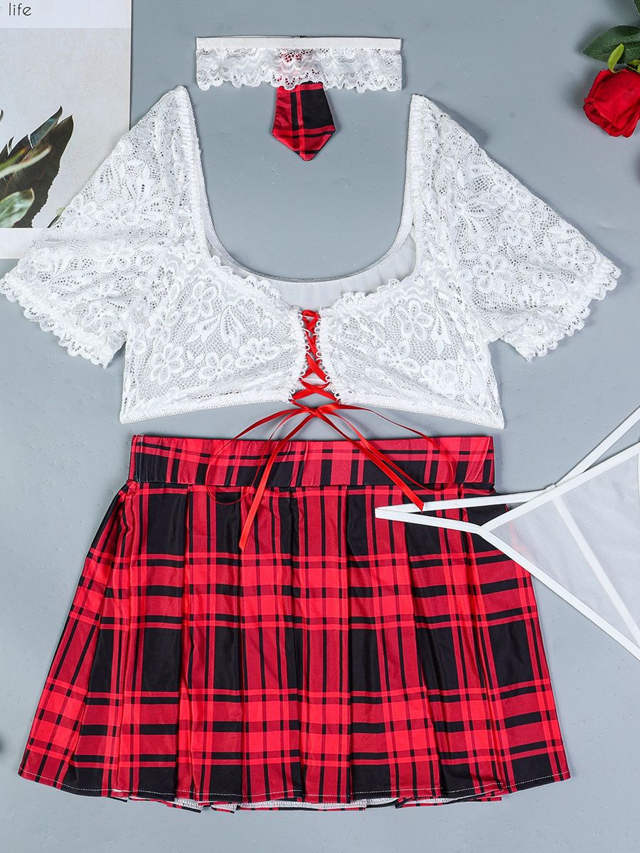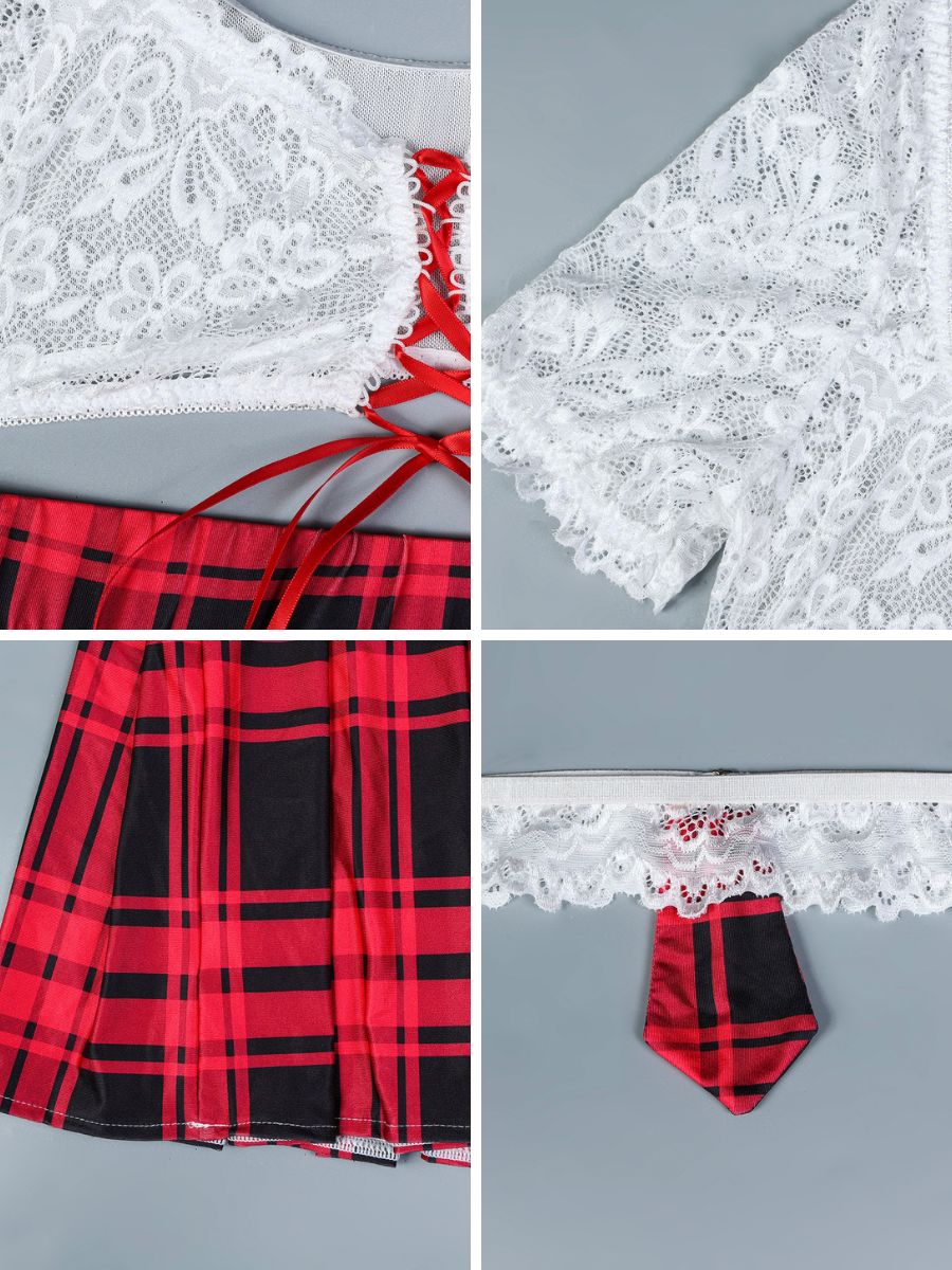Design:  Turn up the heat with this sexy schoolgirl lingerie costume, featuring a delicate white lace crop top with a lace-up front and short sleeves, paired with a red plaid mini skirt, a white thong, and a matching choker with a plaid tie detail that completes the look.